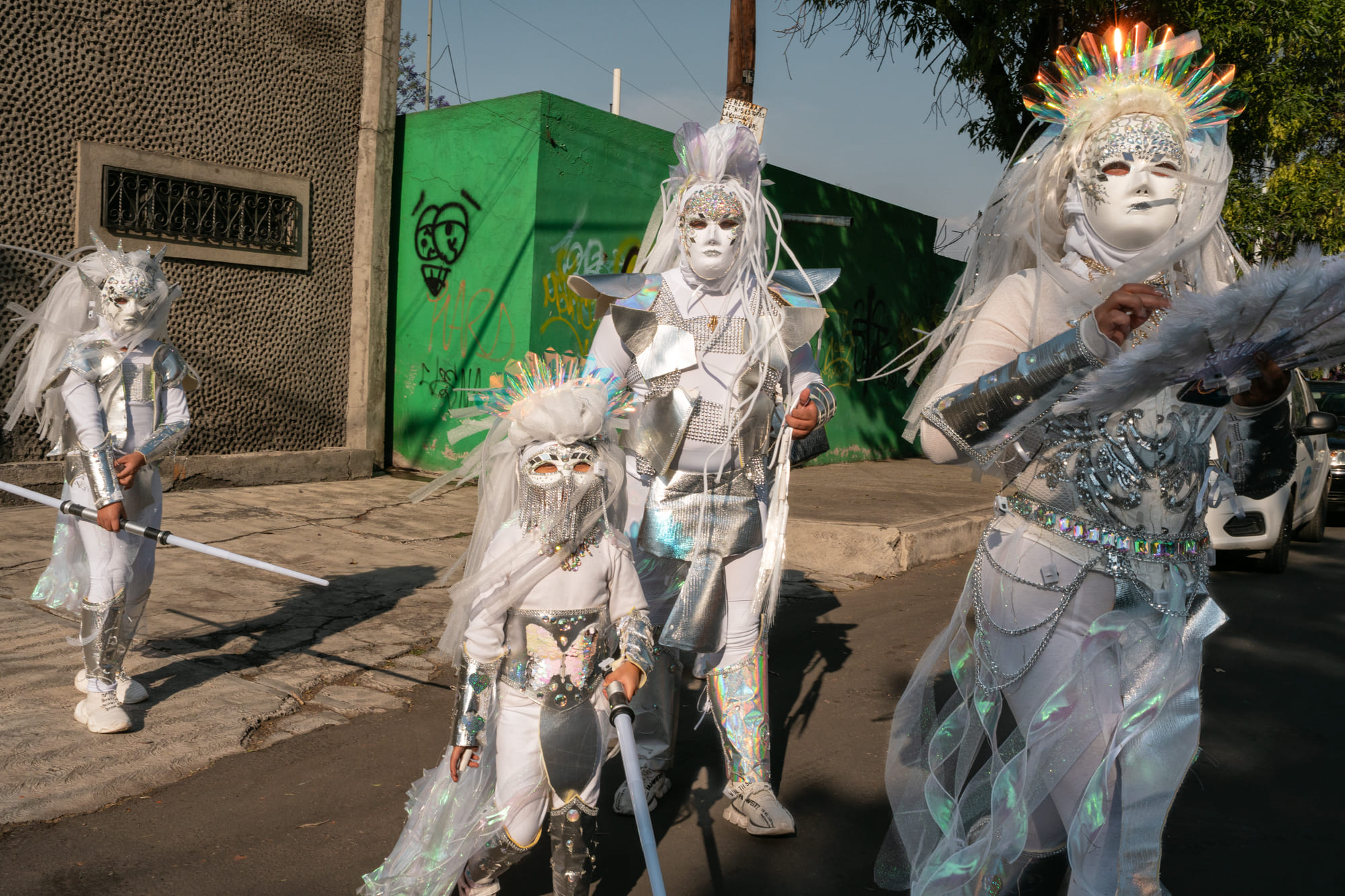 What moved me was the visual and emotional contrast: people dressed in their traditional clothing—and sometimes in costumes that are not traditional at all—walking through asphalt streets, rituals unfolding beside concrete walls and highways.